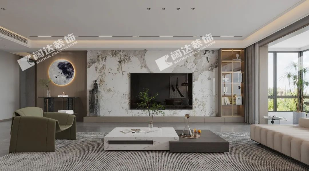 本案通過巖板、墻板、定制電視柜、定制酒柜的設計,頂面采用無主燈線性軌道燈設計,墻頂地多維空間,雖然簡潔,但收納功能強大,且最大程度減少后期打掃衛生的繁瑣性。多種材質和諧地融為一體,滿足了不同年代人們共同的審美需求。空間開闊、舒適,呈現質感的雅奢風范。